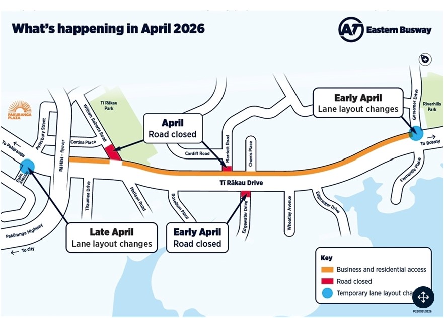 This work is part of the completion of the new Eastern Busway along Tī Rākau Drive. Activities include road widening, intersection upgrades, final surfacing, installing stormwater pipes, and improving pedestrian and cycling facilities. There will be road closures and lane layout changes while this work is carried out. Please drive with care and allow extra time for your journey. Through traffic will be impacted due to road closures and detours.